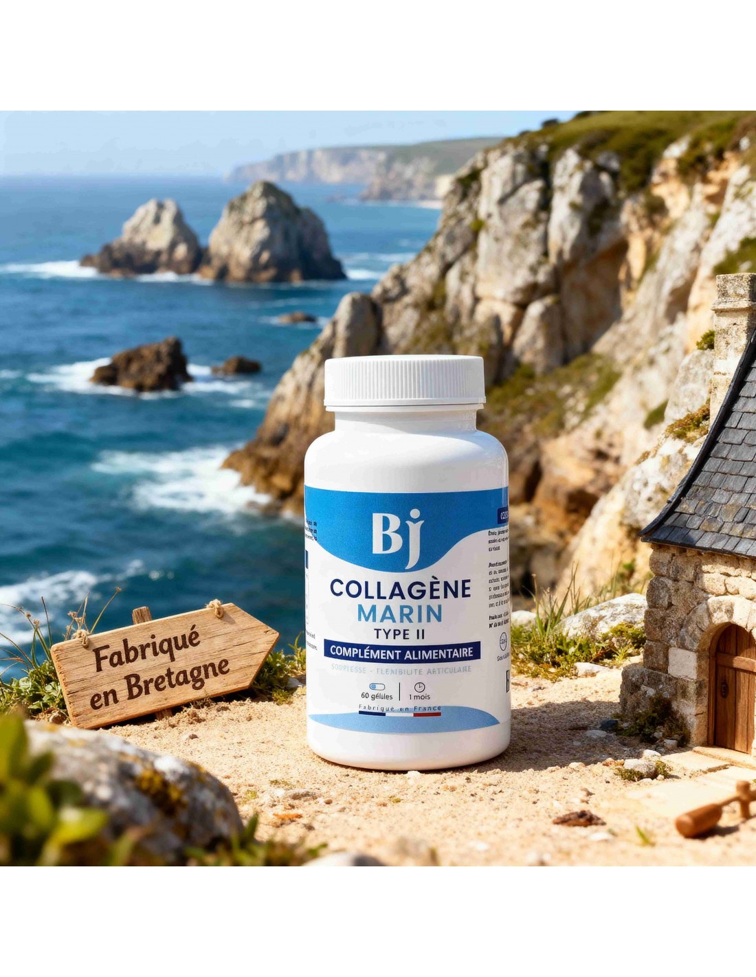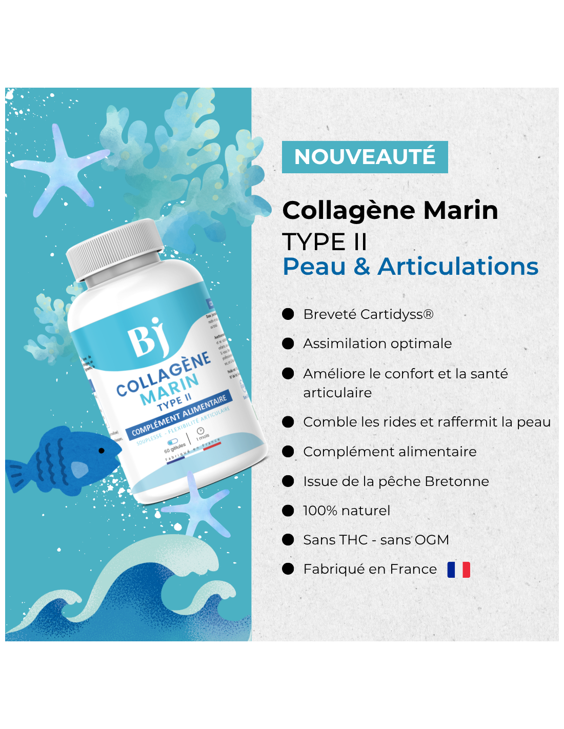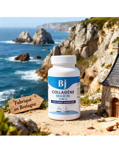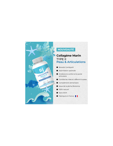 - Peptides de collagène marin Type II hydrolysé (500mg par gélule, 1000mg par dose journalière) - Origine : co-produits de poissons de pêche européenne, transformés en Bretagne